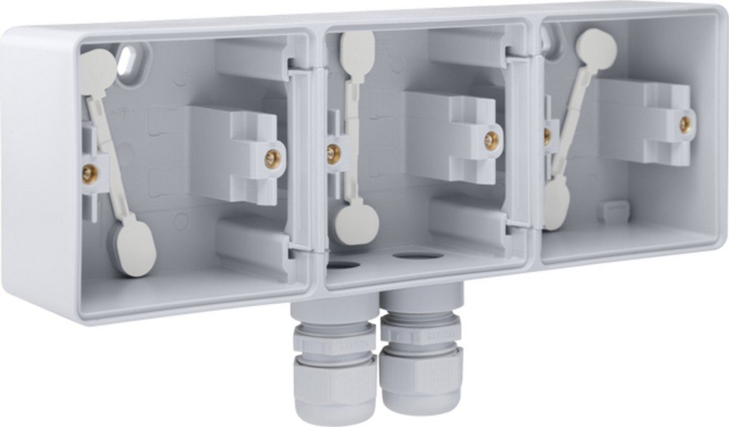 Spuitwaterdichte drievoudige horizontale opbouwdoos met één tweevoudige M20-ingang met wartels voor het inbouwen van drie functies, grey. De opbouwdoos is vervaardigd uit slagvast, stofwerend, halogeenvrij en zelfdovend polypropyleen (UL94-V2/1,6 mm).