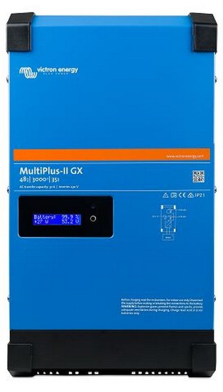 Deze GX versie van de nieuwe omvormer/lader combinatie van Victron Energy is speciaal ontworpen voor off-grid of netstroom gekoppelde PV-installaties en alternatieve stroominstallaties. De MultiPlus-II is een combinatie van een krachtige zuivere sinusgolfomvormer met een vermogen van 3000 VA (2400 Watt), een geavanceerde acculader met adaptieve laadtechnologie van 70 Ampère, en een supersnelle AC-wisselschakelaar, en een GX apparaat met een 2 x 16 character-scherm in een enkele compacte behuizing. De MultiPlus-II heeft VDE- en TOR D4-certificering.
